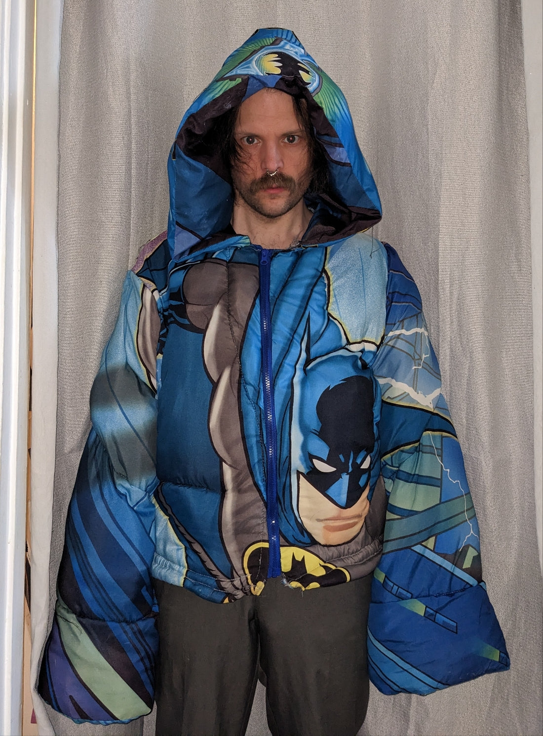 J'ai converti une grosse couverture seconde main en manteau puffer très rembourré. Avec zipper.