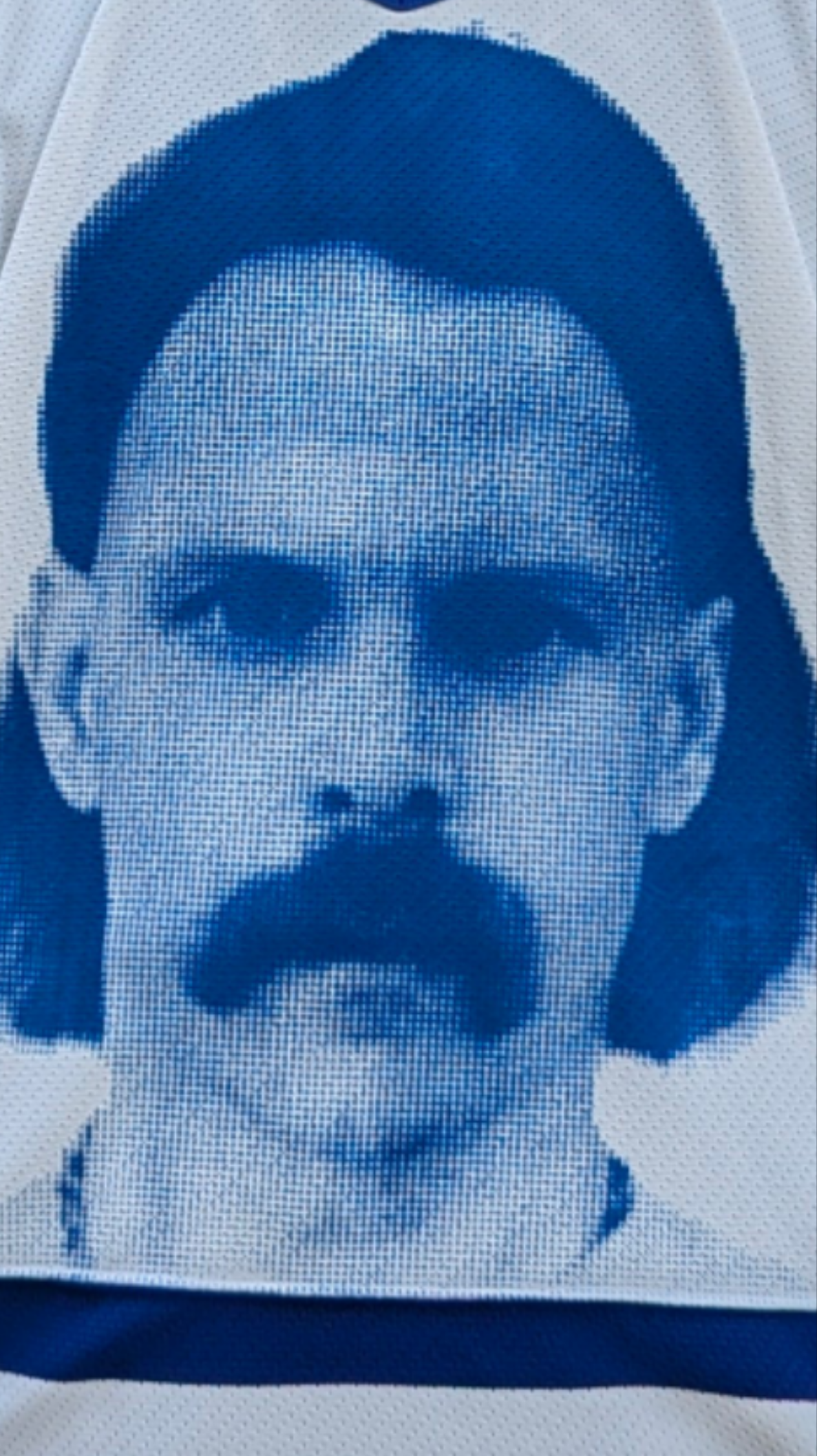 Visage de Murphy Cooper en halftone sérigraphié sur un sweater seconde main déniché en friperie. Le visage est sérigraphié devant comme derrière, voir photos. Il y a une minuscule tache (voir photos) qui vient du proprio initial, vu que c'est du seconde main. Rien de très grave ni apparent!