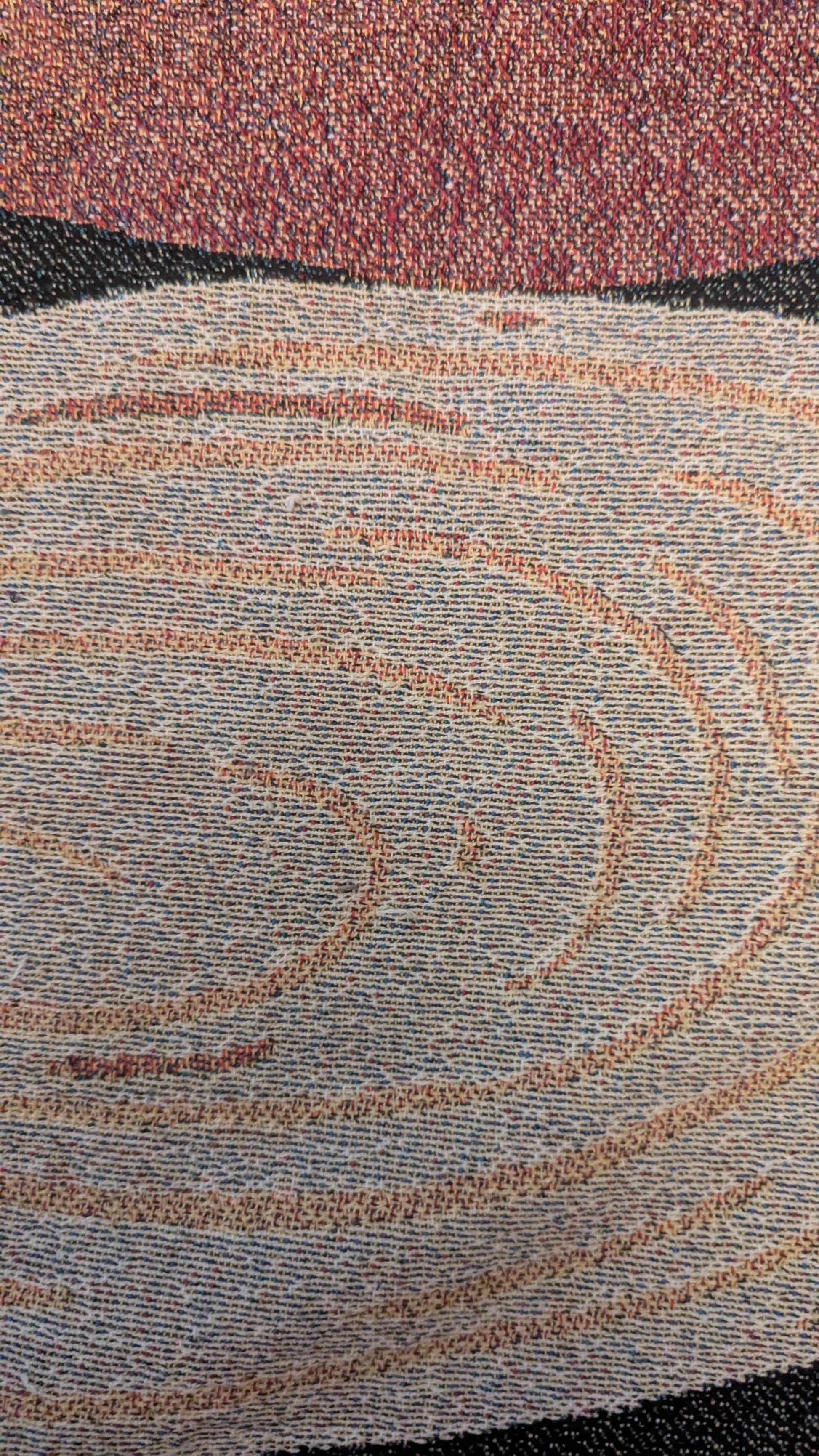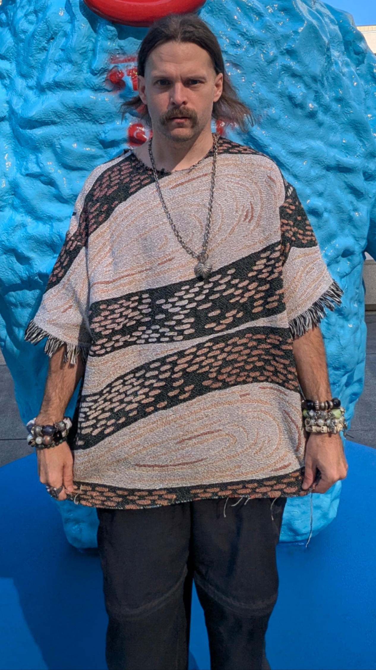 Couverture en tapisserie tissée de seconde main trouvée en friperie et convertie en t-shirt.